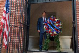 Before the ceremony, Schwarzenegger placed a wreath, with a ribbon that read “America’s First Action Hero. Love, Arnold” inside George Washington’s tomb. He called the moment “an honor.”