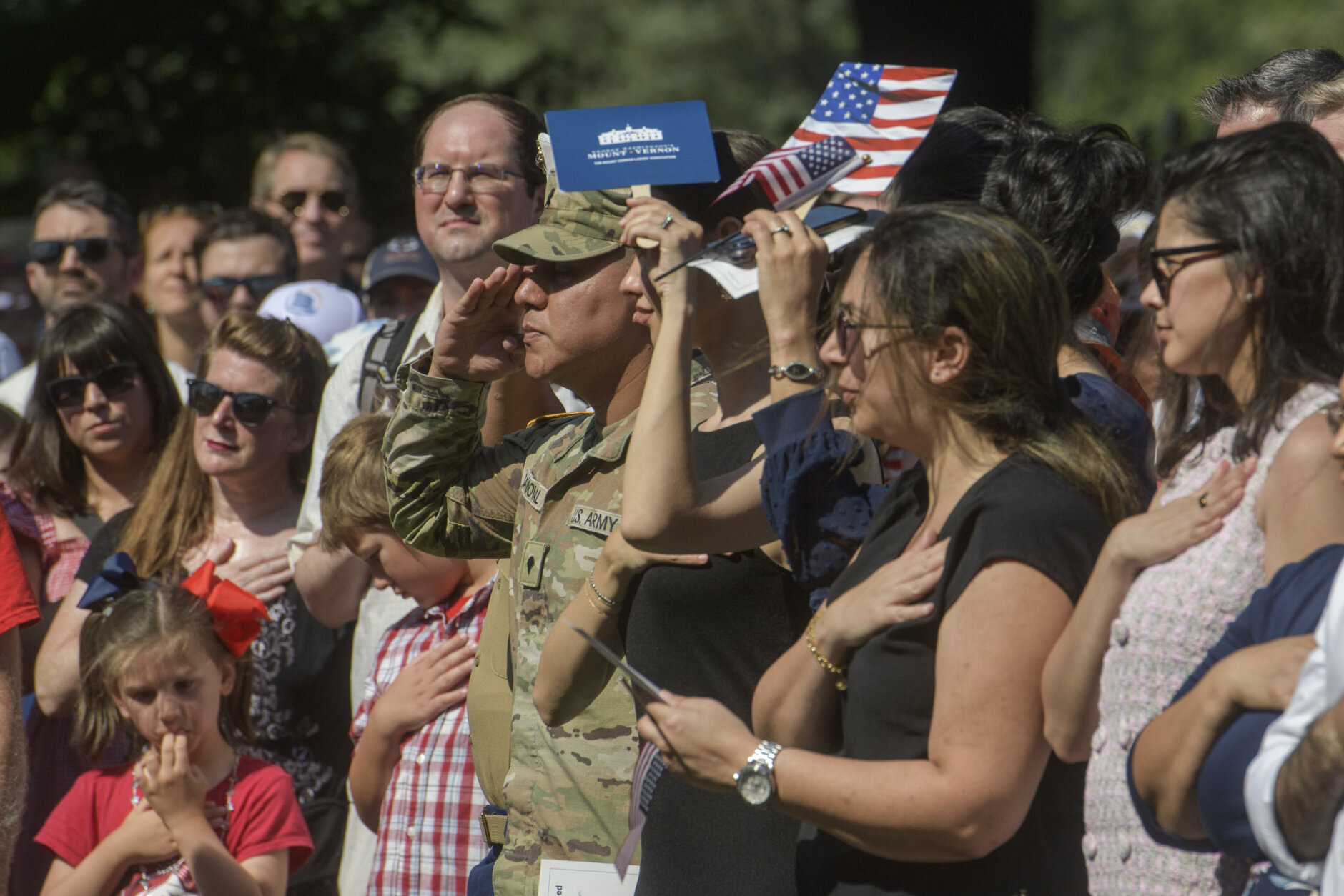 Hundreds gathered at the Virginia home of the first U.S. president for a special naturalization ceremony, with one of the most famous action stars welcoming the new citizens with open arms.