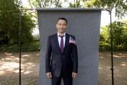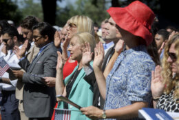 One hundred people from 95 countries became U.S. citizens Friday at George Washington’s Mount Vernon. Movie star and former California Gov. Arnold Schwarzenegger was the keynote speaker, bringing cheers from the crowd after he was introduced.