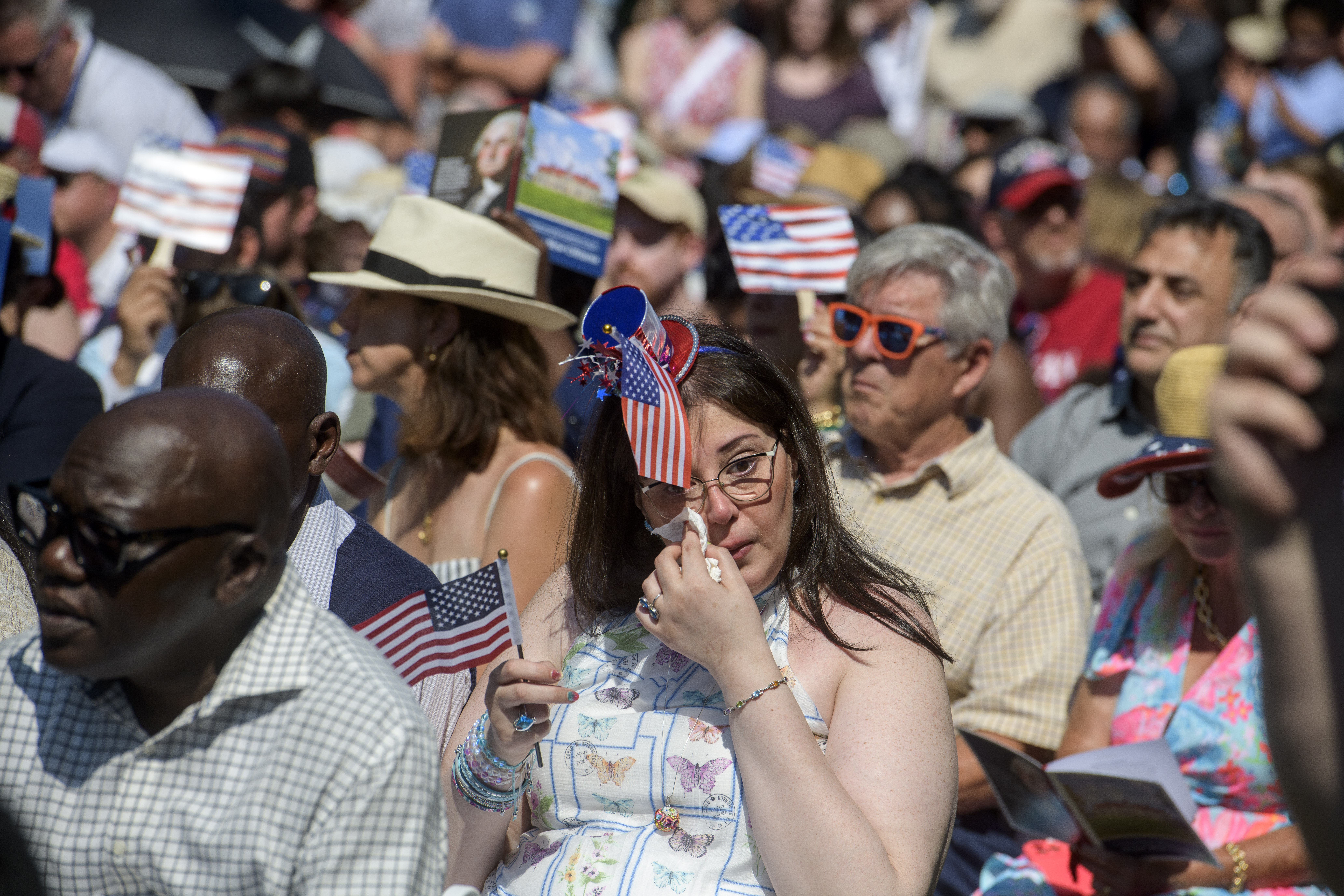 After reciting the oath of allegiance, the new Americans read aloud the Pledge of Allegiance, letting out a big cheer and waving American flags in celebration.