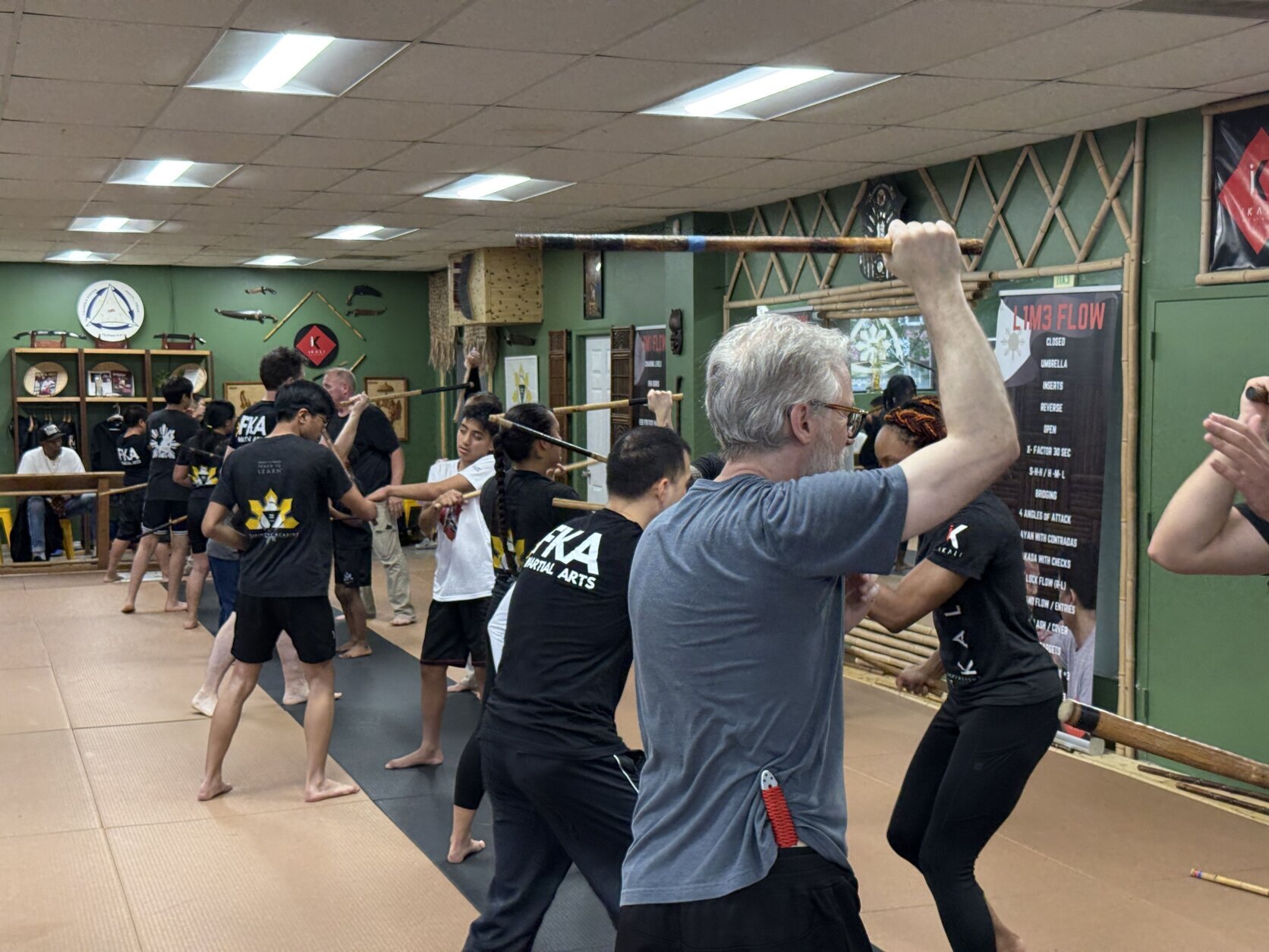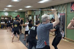 For over an hour, students will drill with each other, throwing crossing right punches, ax and round kicks, and elbows before switching to complex movements with single and double sticks, often going over how to disarm opponents.