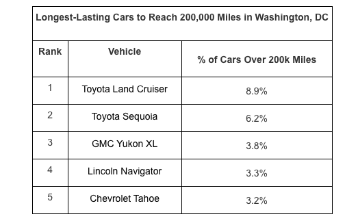 In the Washington market, the top vehicle for making it to 200,000 is the Toyota Land Cruiser; iSeeCars said 8.9% of them on the road around here have reached that milestone.