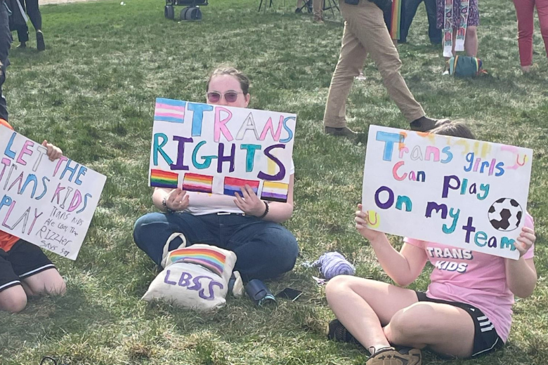 They carried signs with messages such as “Let the Trans Kids Play,” “Trans Lives are Sacred” and “Trans Stories are Everyone’s Stories.”