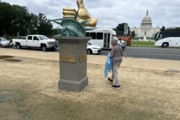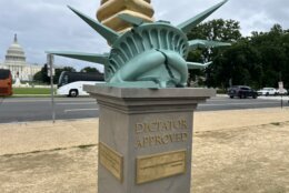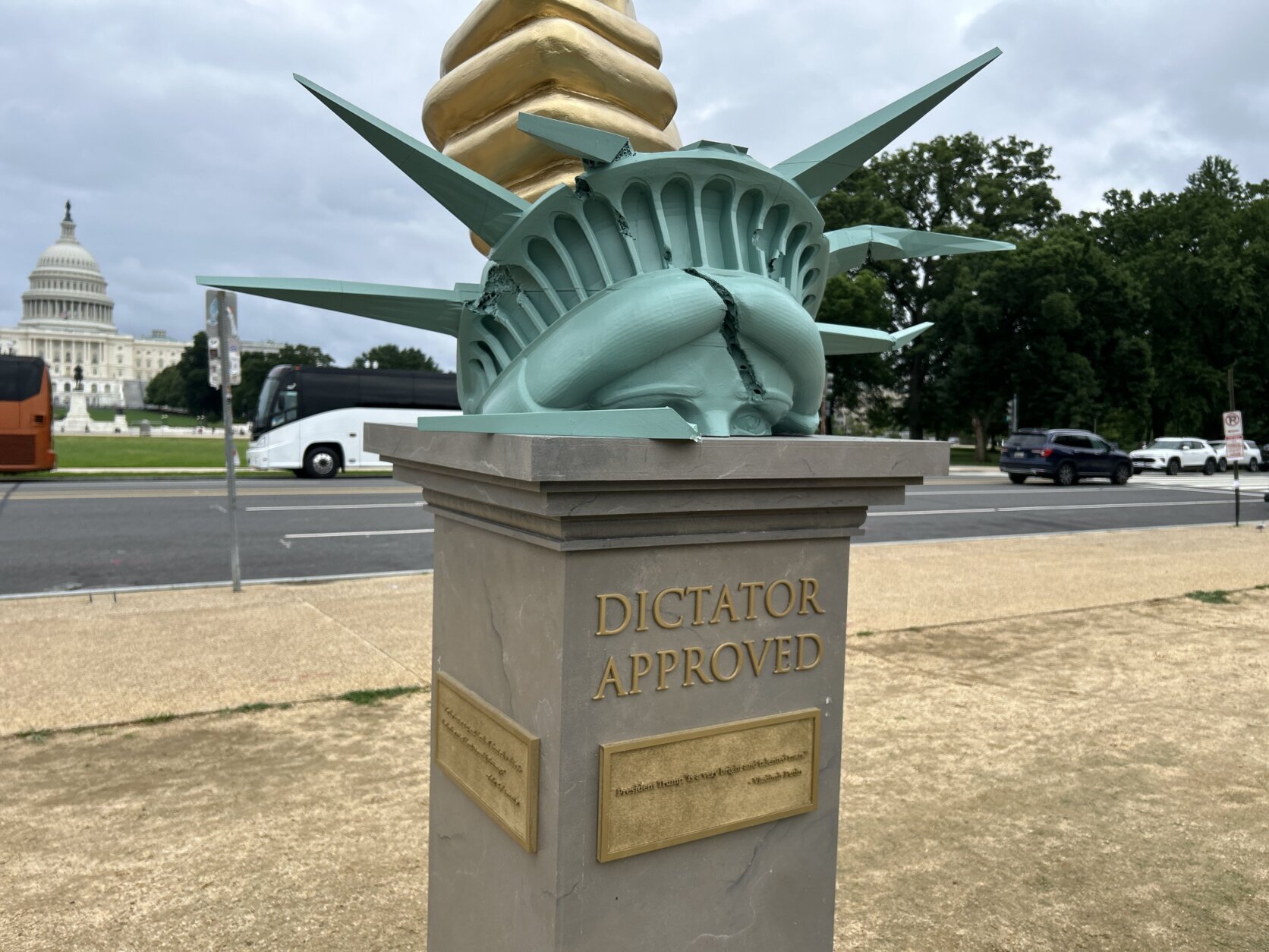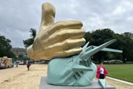 A gold thumb, a crushed Statue of Liberty and satirical quotes are all part of a new statue generating a buzz along the National Mall.