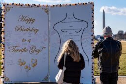 The other side of the card reads “Happy Birthday To A ‘Terrific Guy!’” Epstein’s birthday is January 20. A nearby plaque encourages onlookers to sign the card with a message to the Trump administration.