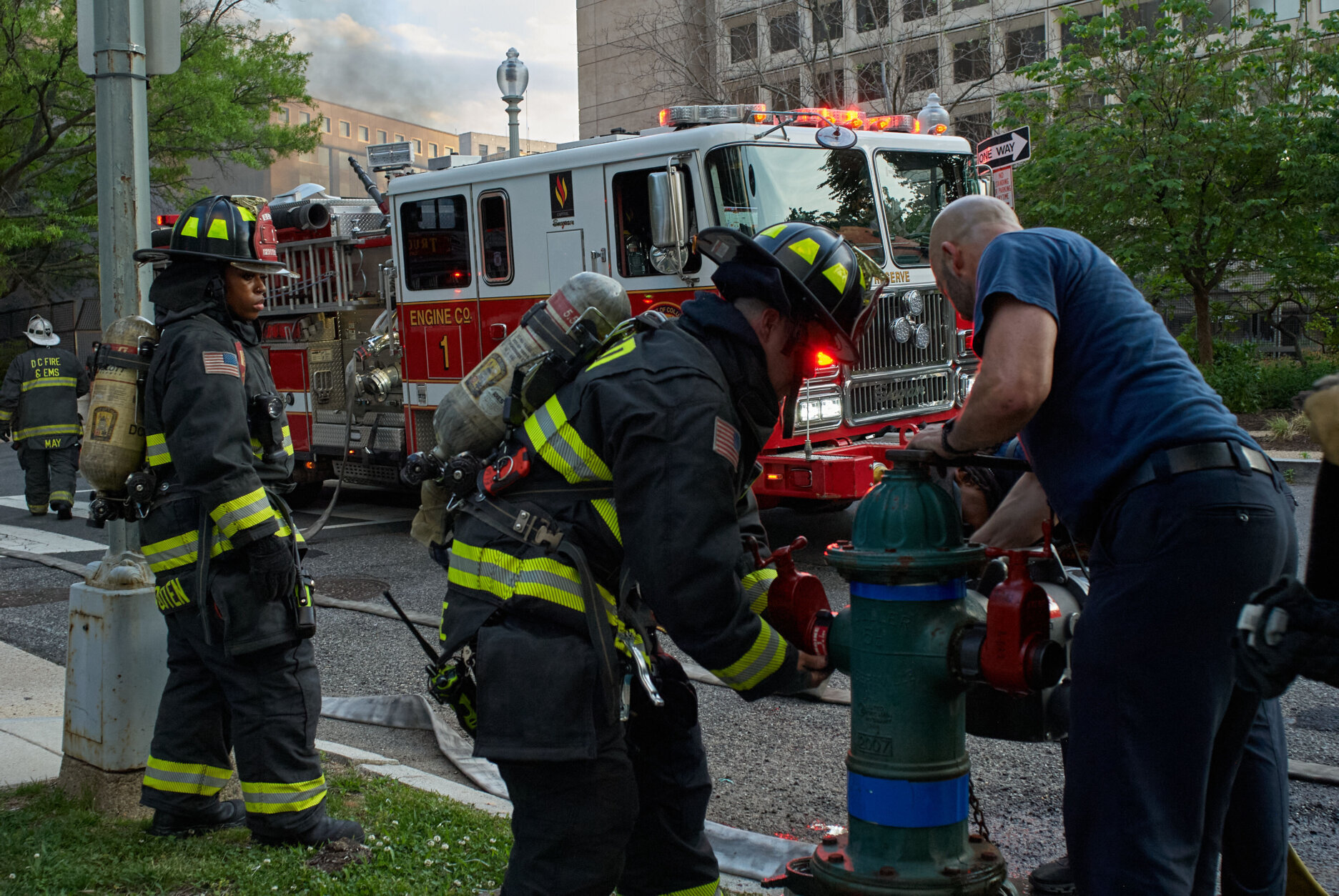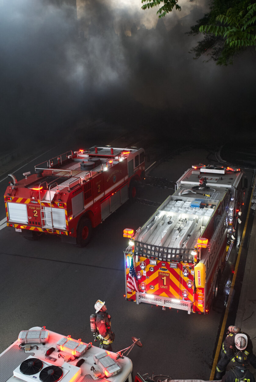 The sounds of construction crews could be heard Friday morning inside the tunnel, just a few hundred feet from where the hybrid diesel bus that caught fire came to rest, under the C St. SW overpass.