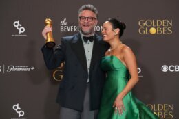 83rd Golden Globes - Press Room Seth Rogen, left, and Chase Sui Wonders pose in the press room with the award for best television series – musical or comedy for "The Studio" during the 83rd Golden Globes on Sunday, Jan. 11, 2026, at the Beverly Hilton in Beverly Hills, Calif. (AP Photo/Chris Pizzello)