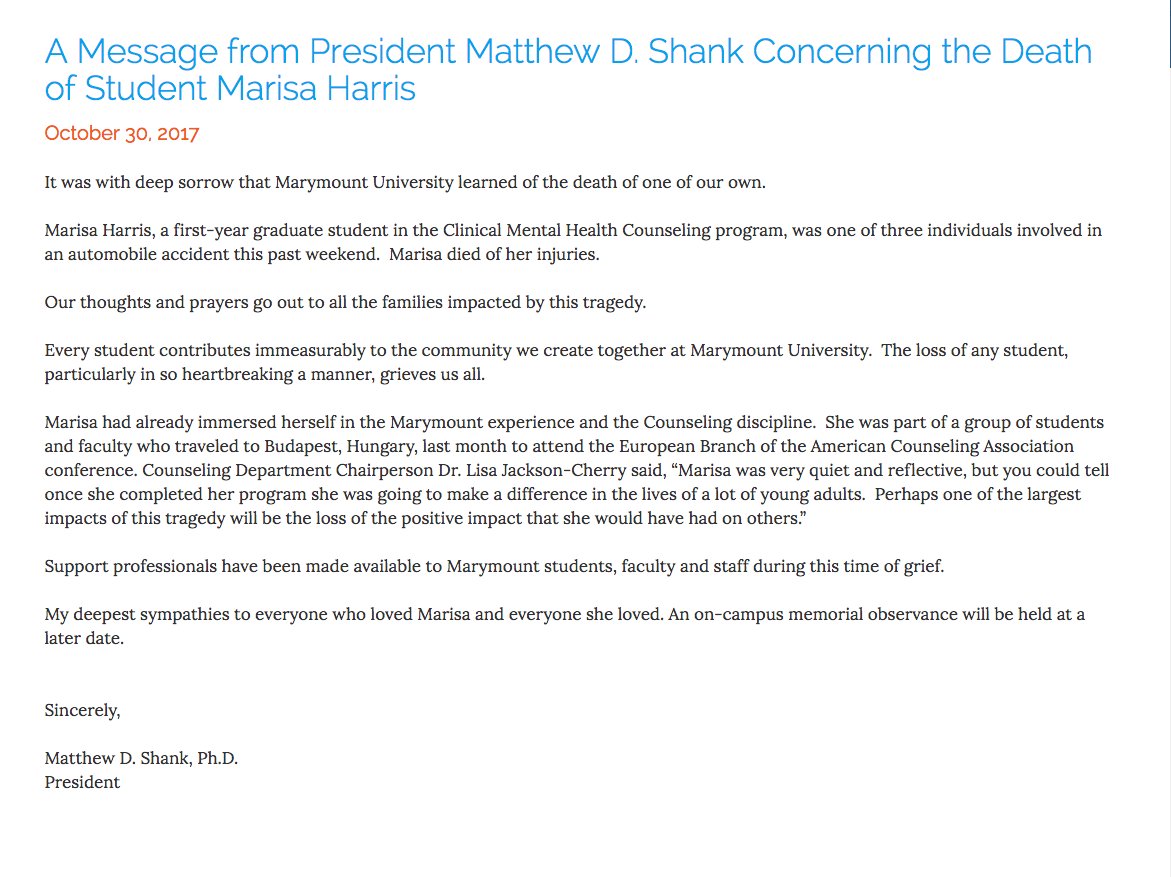 In a statement Monday, university President Matthew D. Shank said that Marisa Harris, 22, of Olney, Maryland, was a first-year graduate student in the Clinical Mental Health Counseling program.