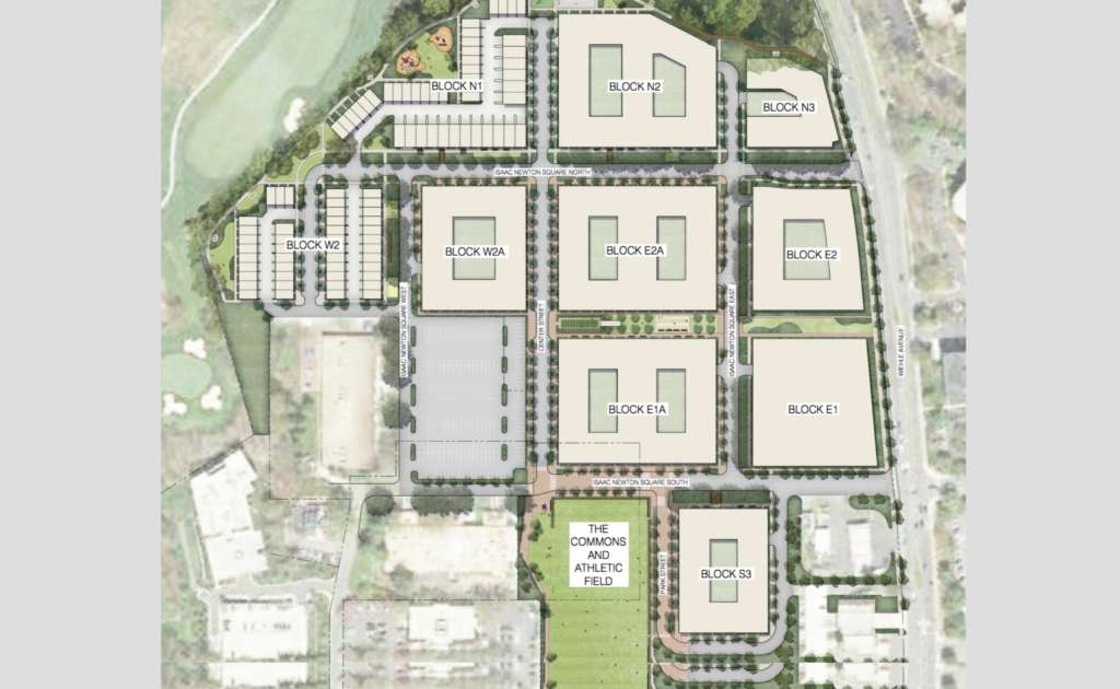 A redevelopment plan before the county could transform Isaac Newton Square, the aging office park at Sunset Hills Road and Wiehle Avenue, into a residential neighborhood with around 2,100 residential units.
