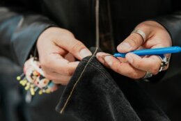 He uses three different sewing machines: a basic one, another for for heavy materials like denim and leather, and an overlock machine, which cuts, trims, and finishes fabric edges simultaneously.