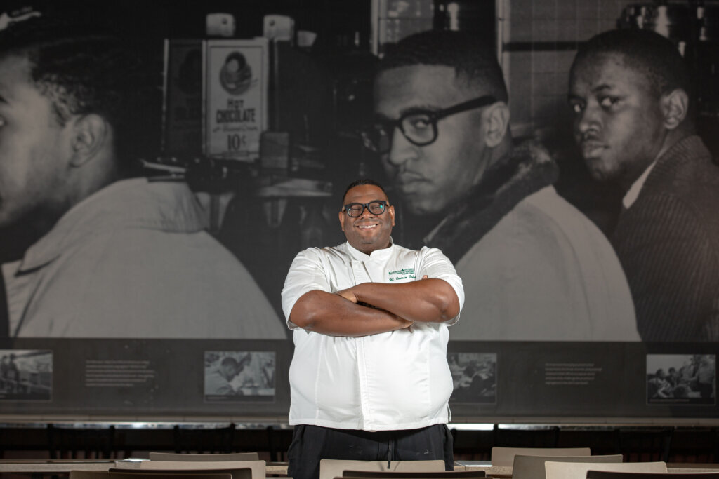 In the concourse level of the museum, you will often see large crowds coiled in a line waiting to get in. Inside the cafe, visitors sit cafeteria-style, surrounded by mementos of African American history, including an entire wall with an image of the four original men who started the Greensboro lunch counter sit-ins.