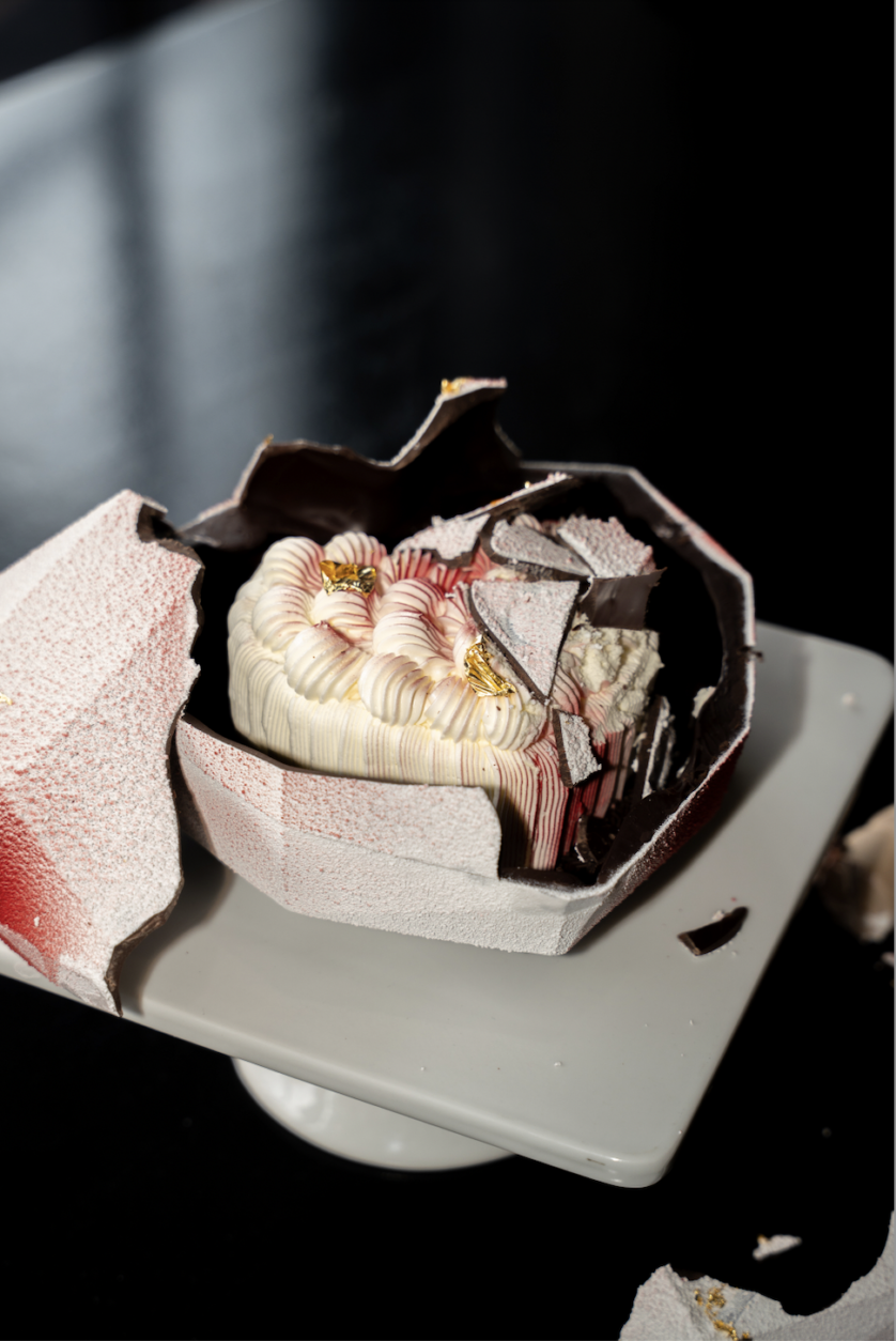 The main attraction this year is the “Breakable Heart Chocolate Dome,” a five-inch heart-shaped dessert made from Valrhona 64% dark chocolate. It is designed to be cracked open with a wooden hammer to reveal a heart-shaped vanilla sponge cake layered with strawberry gelée and finished with smooth Italian meringue buttercream. Before digging in, guests are instructed to warm and pour dark chocolate sauce overtop. This dessert is $95.