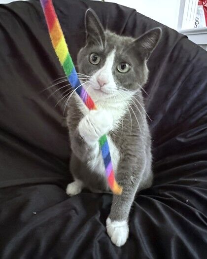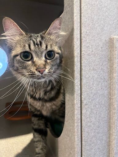Miss District is a stunning grey and white tabby whose perfectly symmetrical markings are as regal as her name suggests. She’s the picture of grace — a gentle balance of independence and affection. This lovely girl enjoys quiet moments sunbathing or lounging in cozy corners, but she truly shines during one-on-one time with her humans. Offer her gentle pets and a few tasty treats, and you’ll be rewarded with affectionate head bumps and soft purrs that melt your heart.