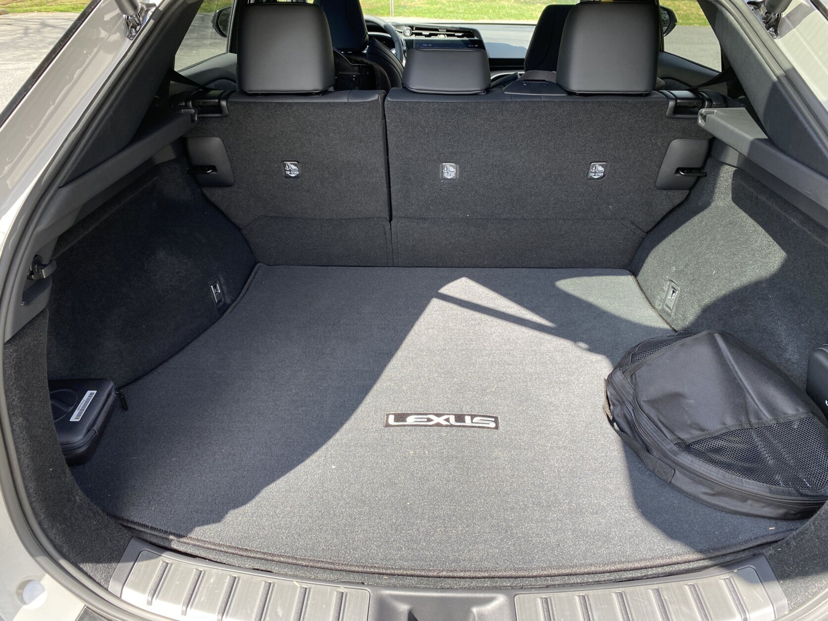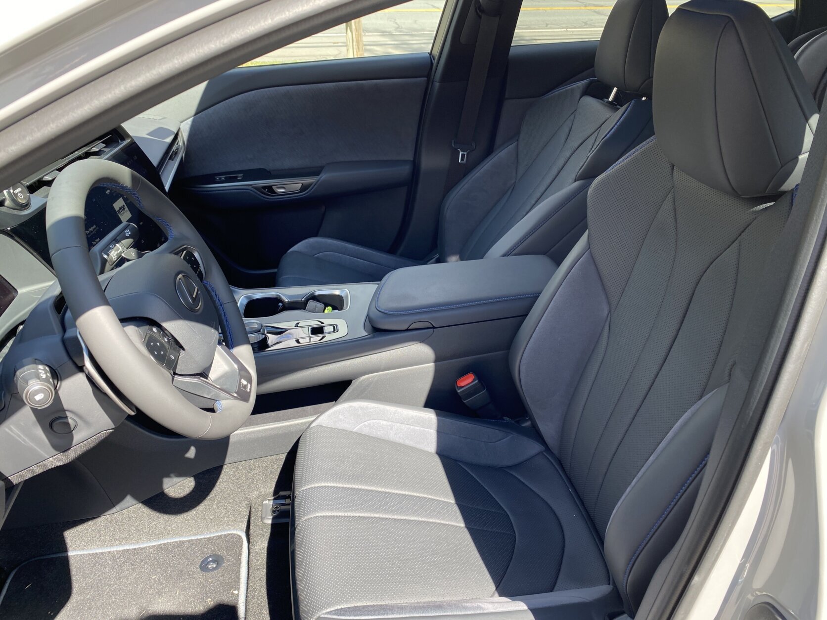 Though most would simply call this paint color gray, Lexus labels it “Wind.” Inside, there’s black Ultrasuede trim with blue stitching. It’s a handsome interior befitting the luxury brand. Front seats are supportive and nicely bolstered, and the rear seat is spacious.