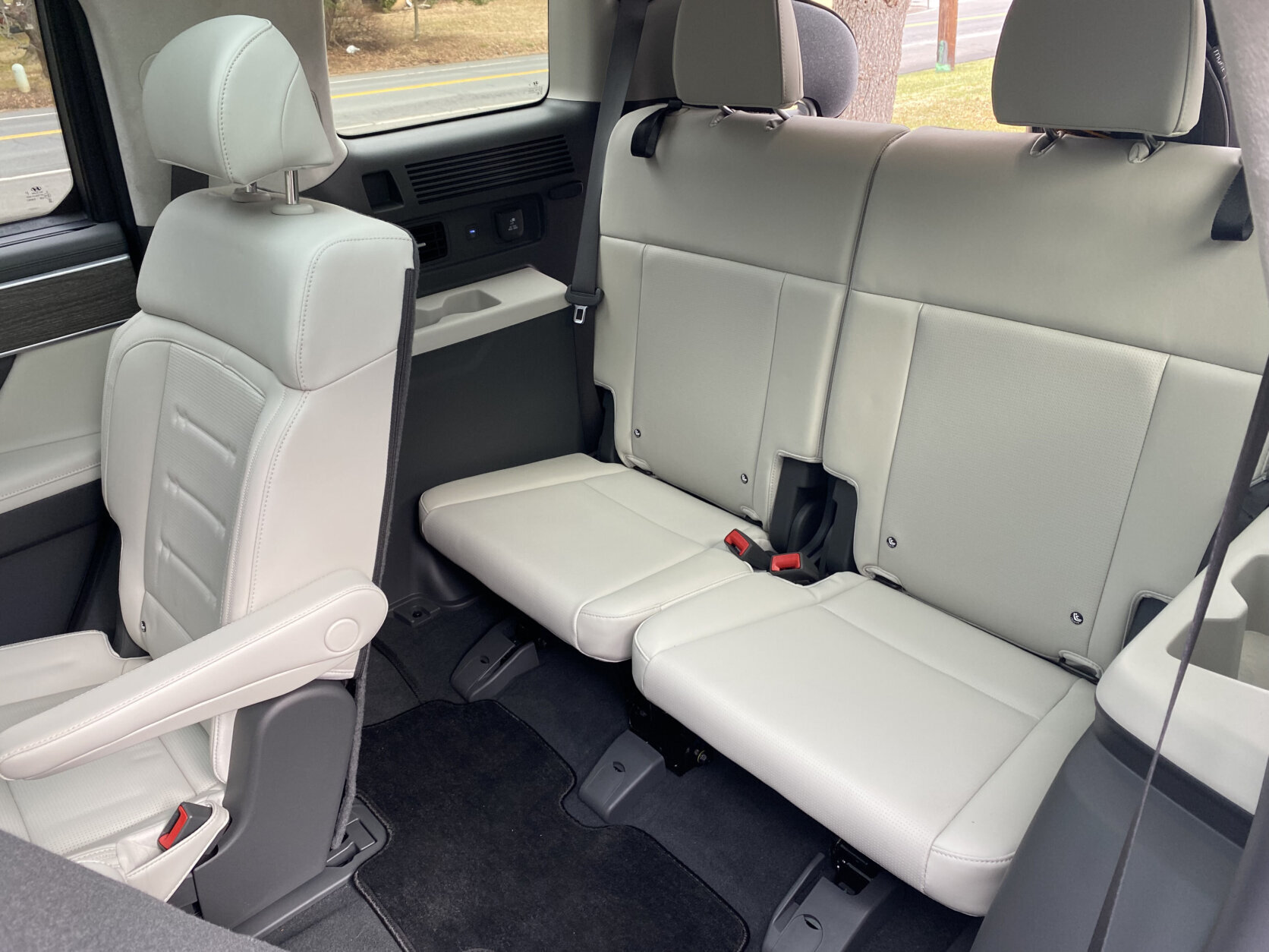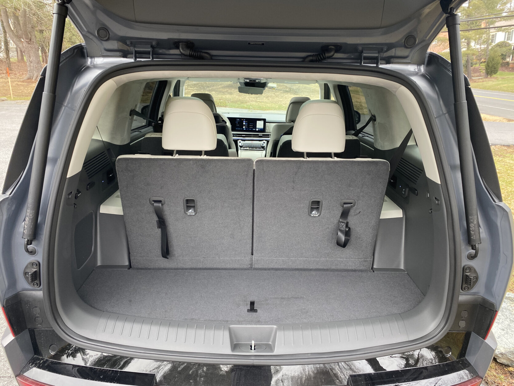 This does have a third row, but it’s tight and most of your cargo space goes away with it up. There’s no spare tire.