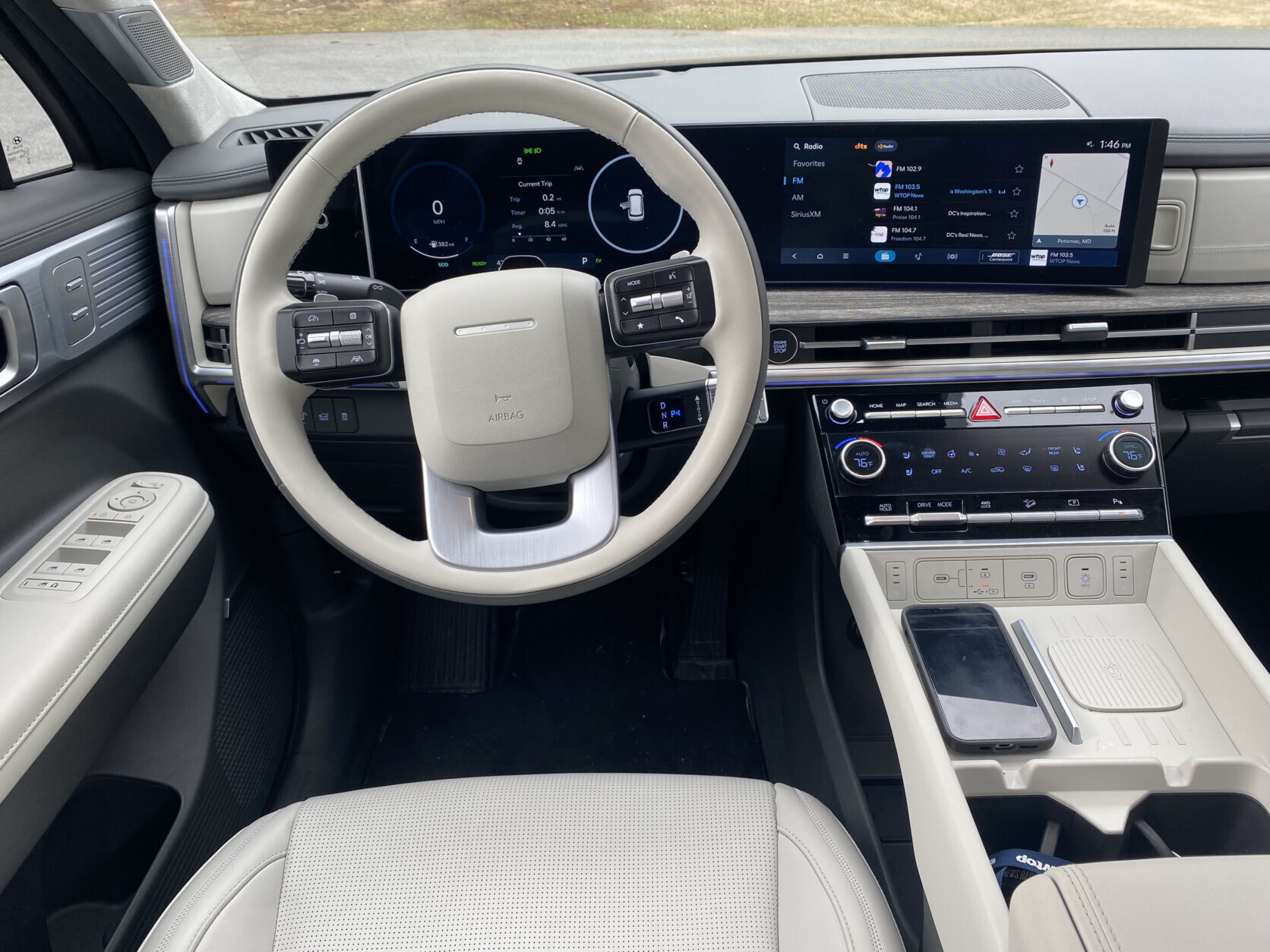 And get this: There are not one but two wireless phone chargers. Why hasn’t everyone thought of that? No more sharing with your passenger is necessary. There’s even a dash compartment that sanitizes your phone. It also has Hyundai’s brilliant blind spot viewing feature, which shows a camera image of your blind spot on the dash screen when you activate the turn signal.