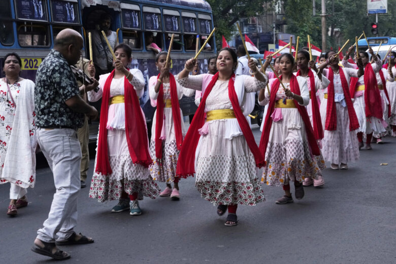 Indian Catholics dance in the street as the walk in a procession celebrating Easter Sunday commemorating the day when according to Christian tradition Jesus was resurrected in Jerusalem two millennia ago, in Kolkata, India, Sunday, April 20, 2025.