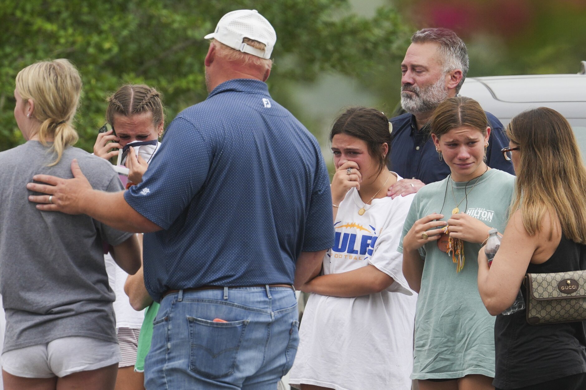 People react as they inspect an area outside sleeping quarters at Camp Mystic along the banks of the Guadalupe River after a flash flood swept through the area Sunday, July 6, 2025, in Hunt, Texas.