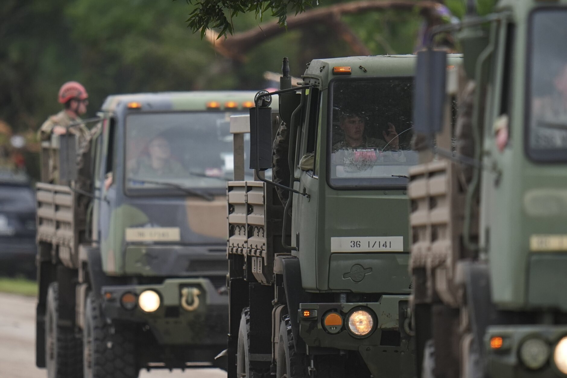 A military convoy drives on a road along the Guadalupe River after a flash flood swept through the area Saturday, July 5, 2025, in Hunt, Texas.