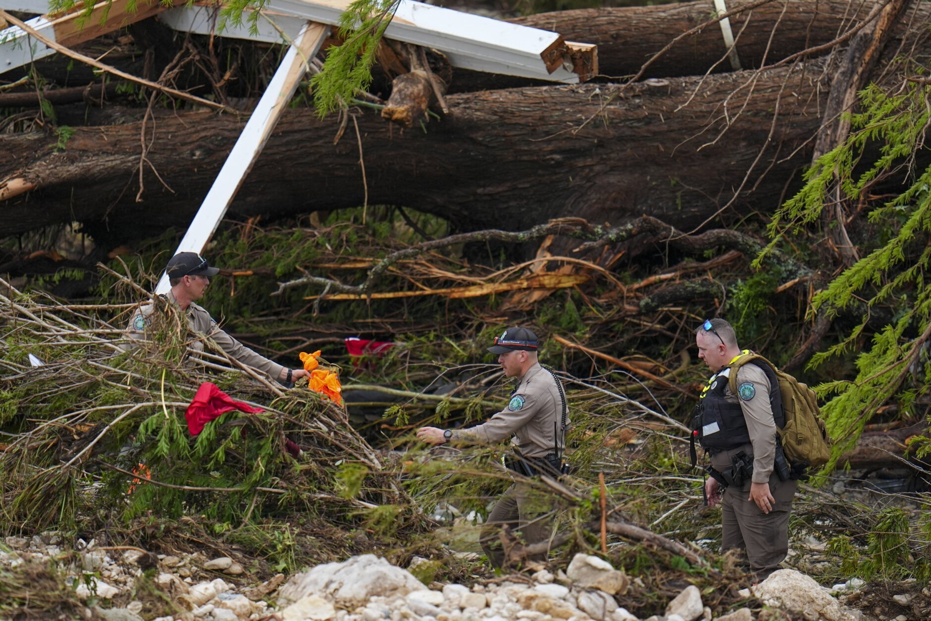 Officials with the Texas Game Warden comb through debris along the banks of the Guadalupe River after a flash flood swept through the area Saturday, July 5, 2025, in Hunt, Texas.