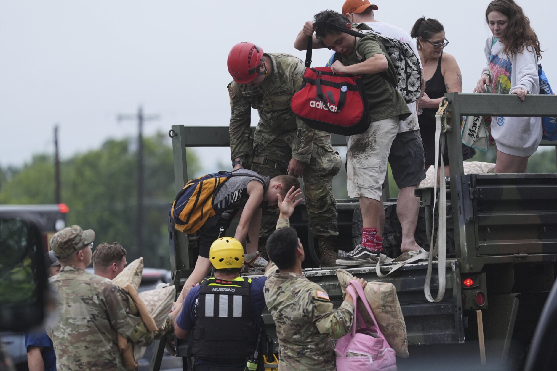 First responders deliver people to a reunification center after flash flooding in the area, Friday, July 4, 2025, in Ingram, Texas.