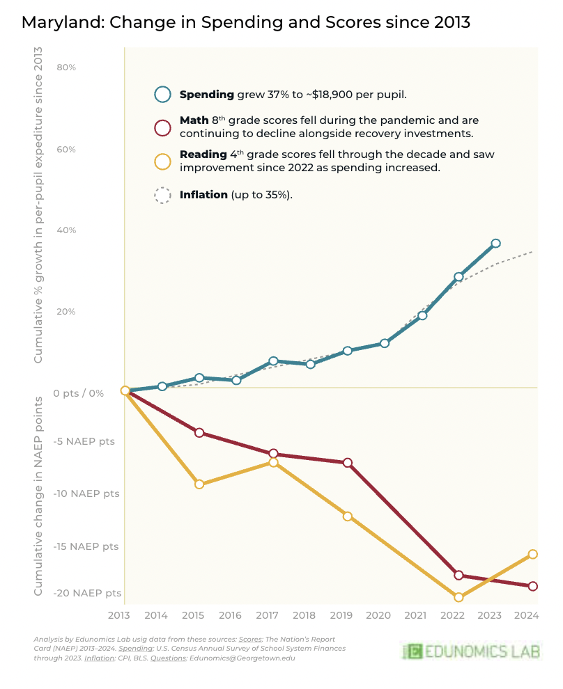 She said the organization’s new report, titled “The State of Reading in Maryland 2025: It’s Time for a Comeback After a Decade of Decline,” shows that education spending has grown 37%, but that’s not paying off when it comes to students being able to read.