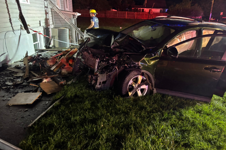 A damaged vehicle is seen near a home on the 400 Block of University Boulevard West and Dennis Avenue on July 4. A car collision left the driver hospitalized and the home’s occupants displaced in Maryland.