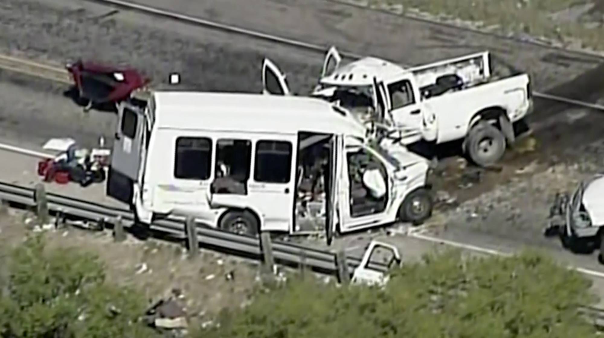 UVALDE, Texas (AP) — A small shuttle bus carrying Texas church members home from a retreat collided head-on with a pickup truck, killing 13 people and injuring two others Wednesday on a two-lane highway in southwestern Texas, officials said.