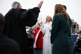According to “A Guide to Virginia Protocol and Traditions,” males in the official party wear morning coats, a formal daytime suit with long tails, and women wear dark suits for the inauguration. Many, including the new governor’s husband, kept to that tradition on Saturday.