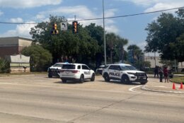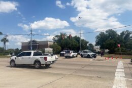 By late afternoon, dozens of police cars still were clustered in the parking lot, multiple helicopters hovered overhead and armed officers in bulletproof vests patrolled the area.