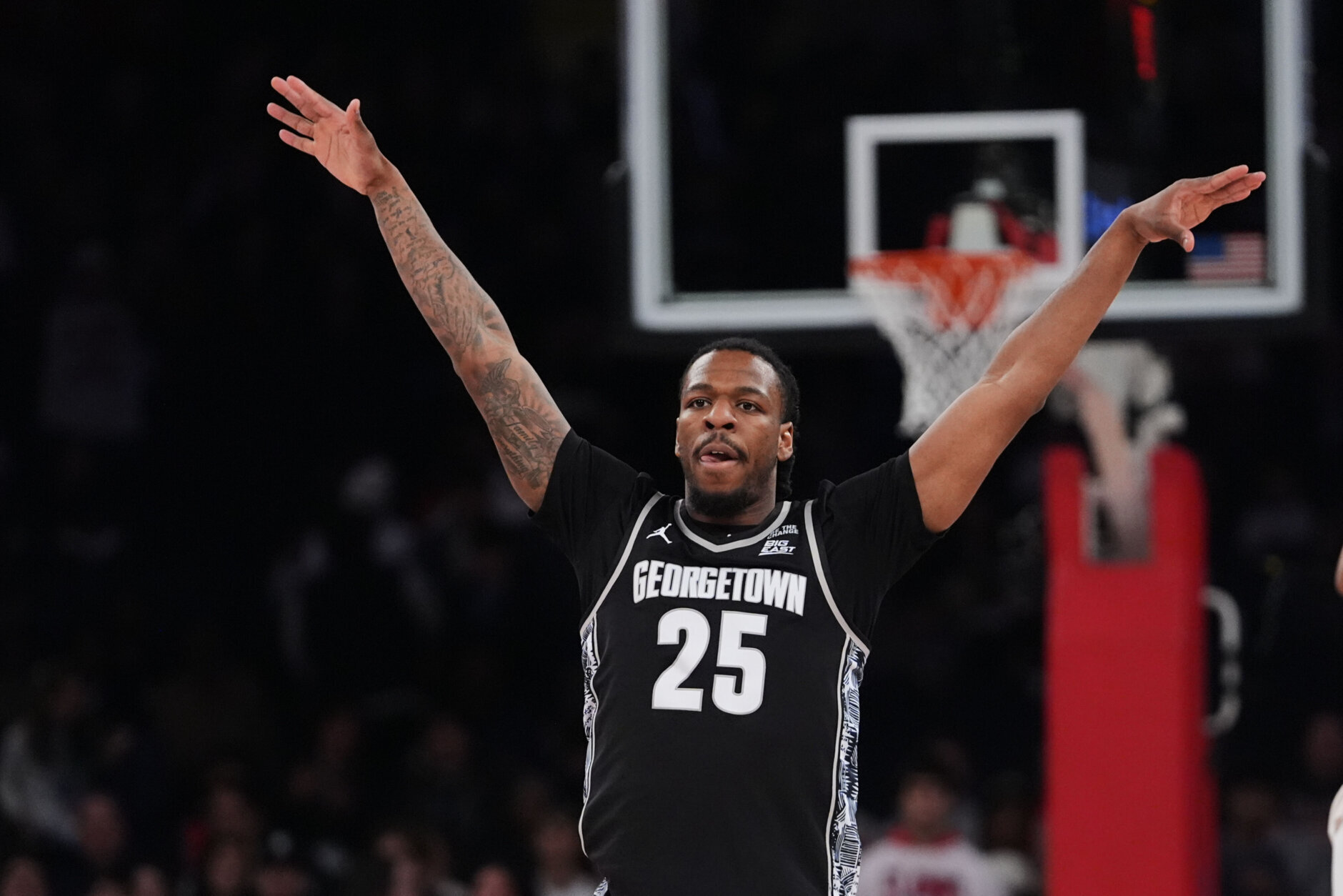 Georgetown St Johns Basketball Georgetown Hoyas' Jeremiah Williams (25) gestures after making a three-point shot during the first half of an NCAA college basketball game against the St. John's Red Storm Tuesday, March 3, 2026, in New York. (AP Photo/Frank Franklin II)