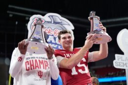 Philadelphia Phillies slugger Kyle Schwarber was an honorary captain for Indiana and watched the game from the Hoosiers’ sideline. Former Oregon and Carolina Panthers running back Jonathan Stewart was the Ducks’ honorary captain.