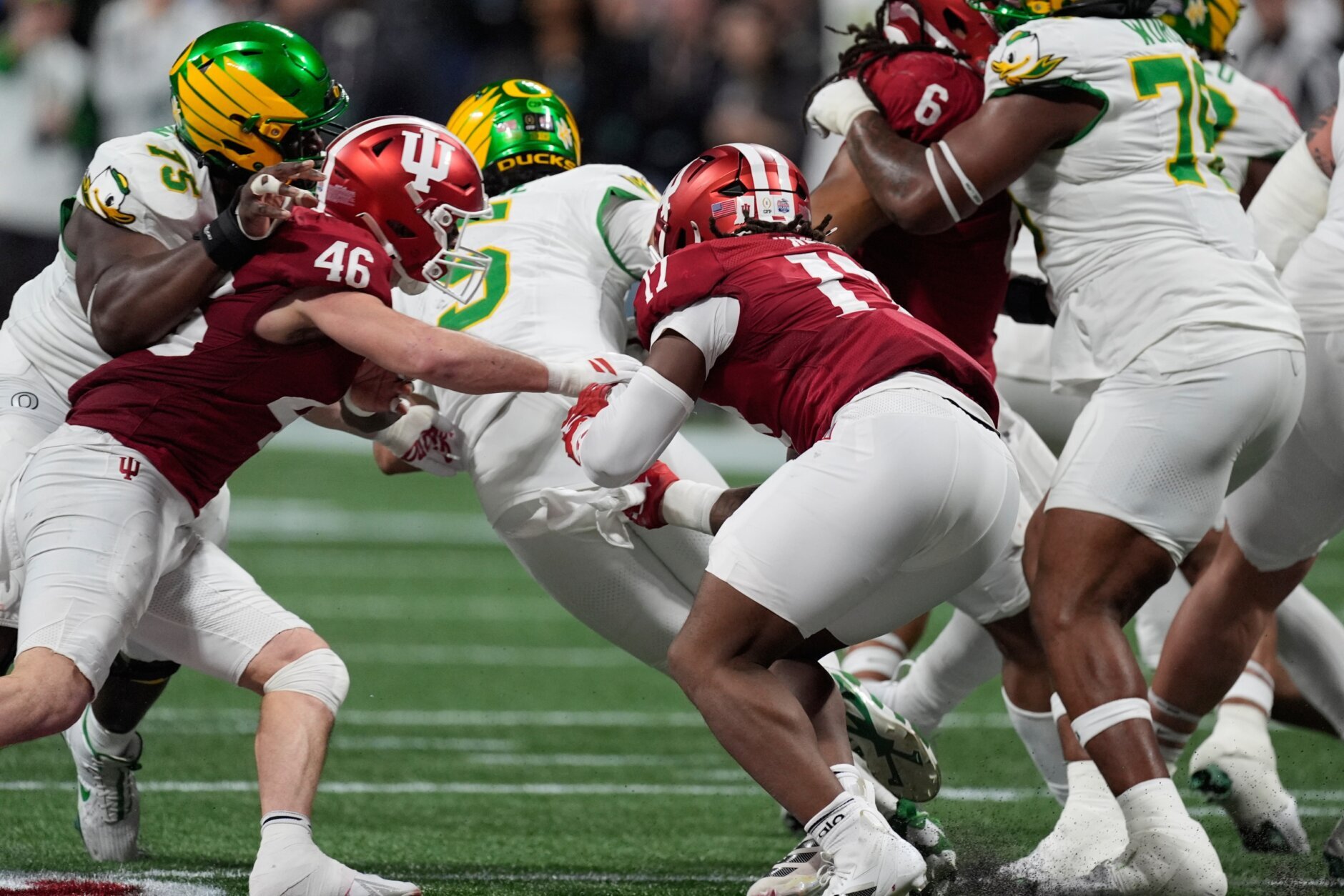 ATLANTA (AP) — With two rushing touchdowns, five passing touchdowns, three forced turnovers and a blocked kick, No. 1 Indiana’s domination of No. 5 Oregon was balanced and impressive.