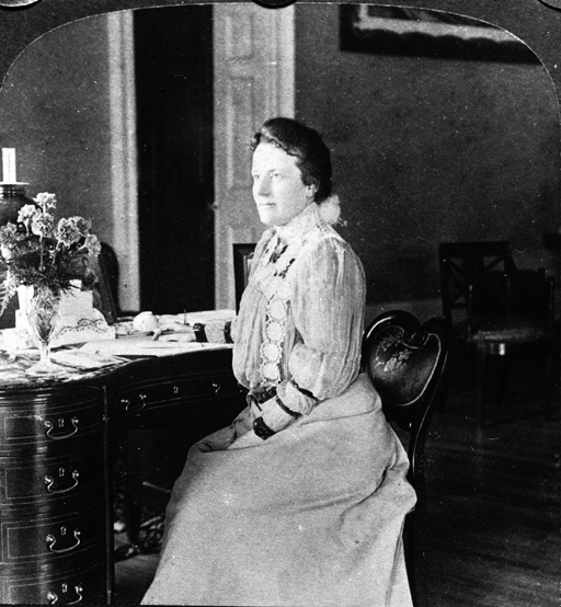 U.S. First Lady Edith Roosevelt (1861 - 1948) sits at her desk in the second floor private library of the White House, 1903. She was the second wife of president Theodore Roosevelt. (Photo by Hulton Archive/Getty Images)