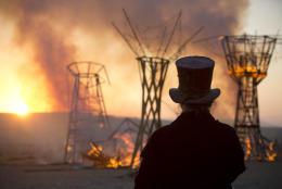 APTOPIX Mideast Israel Burning Man Photo Essay In this Saturday, June 7, 2014, photo, a man looks at a wooden sculpture that was set on fire during Israel's first Midburn Festival, modeled after the popular Burning Man Festival held annually in Nevada's Black Rock Desert, near the Israeli kibbutz of Sde Boker. Some 3,000 people set up a colorful encampment in the dusty moonscape, swinging from hoops by day and burning giant wooden sculptures by night. (AP Photo/Oded Balilty)
