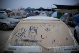 Mideast Israel Burning Man Photo Essay In this photo taken Wednesday, June 4, 2014, hand writing and doodles adorn a dusty car during Israel's first Midburn festival, modeled after the popular Burning Man festival held annually in the Black Rock Desert of Nevada, in the desert near the Israeli kibbutz of Sde Boker. For five days, participants _ mostly Israelis _ created a temporary city dedicated to creativity, communal living and what the festival calls "radical self-expression." (AP Photo/Oded Balilty)
