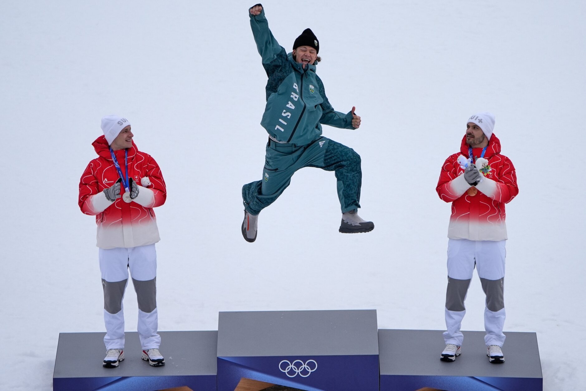 Milan Cortina Olympics My Favorite Photo Brazil's Lucas Pinheiro Braathen, center, winner of an alpine ski, men's giant slalom race, jumps in celebration on the podium flanked by second-place Switzerland's Marco Odermatt, left, and third-place Switzerland's Loic Meillard, at the 2026 Winter Olympics, in Bormio, Italy, Feb. 14, 2026. (AP Photo/John Locher, File)