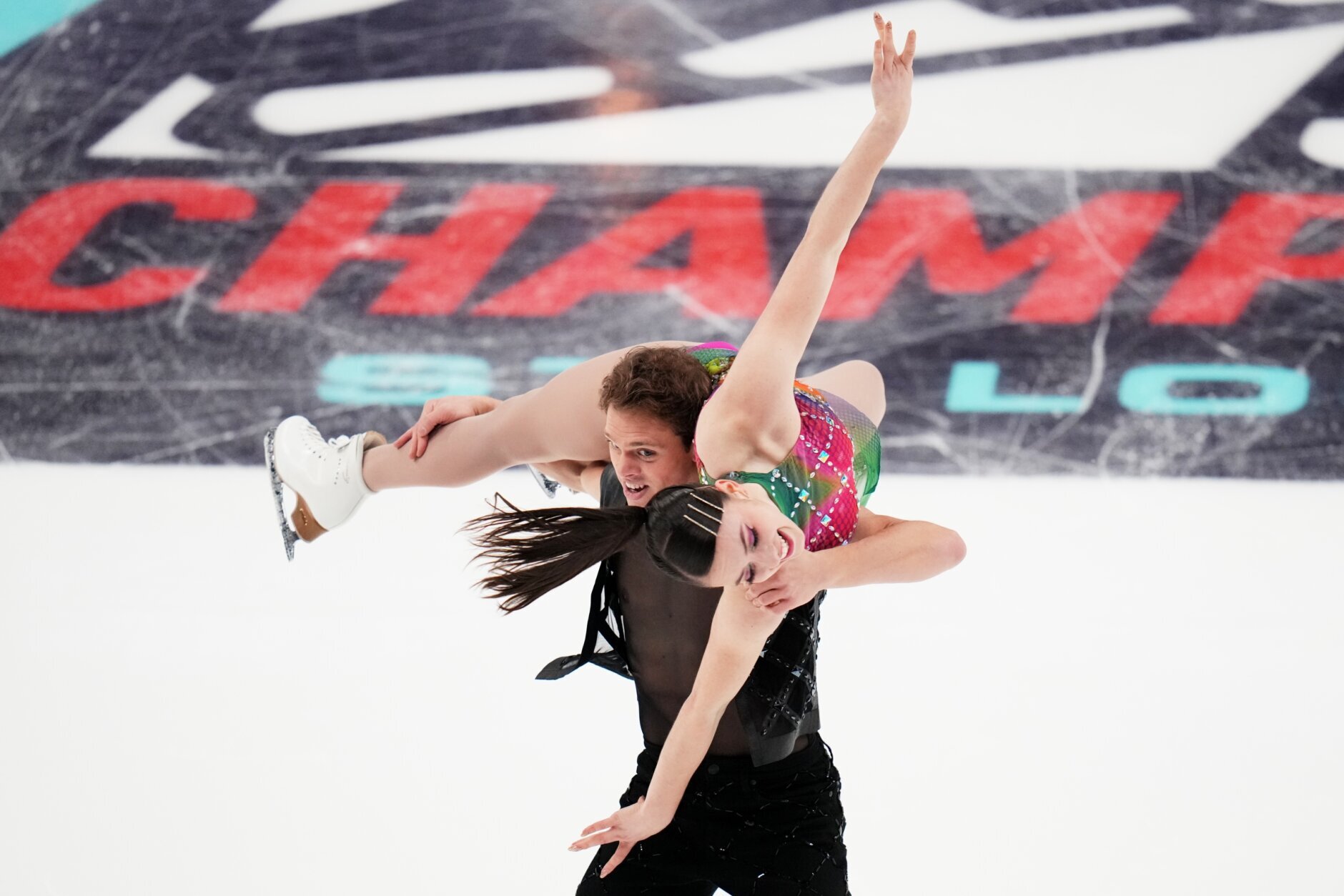 Earlier in the night, Madison Chock and Evan Bates rocked their way through a Lenny Kravitz-inspired rhythm dance to build a big lead as they try to break a tie with Meryl Davis and Charlie White by winning a record seventh ice dance championship.