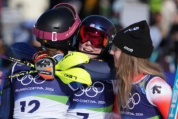 In emotional scenes after the race, the 30-year-old Shiffrin was embraced by Camille Rast of Switzerland, who took silver, and bronze-medalist Anna Swenn Larsson before fighting back tears as she approached her mom and coach, Eileen, for a long, deep hug next to the finish area.