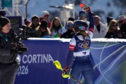 CORTINA D’AMPEZZO, Italy (AP) — Mikaela Shiffrin stood atop the Olympic podium, looking almost in disbelief at the gold medal around her neck.