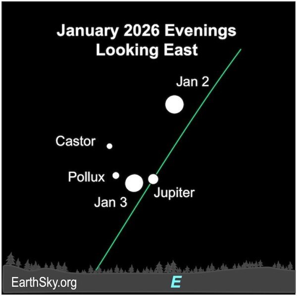 On Saturday after sunset, the very bright, almost full wolf moon meets up with brilliant Jupiter in the east after sunset. The two will be close together for quite the sky sight with the moon illusion. Get out those smartphones and cameras for a beautiful astro pic session.