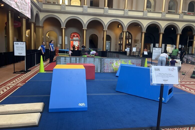 Starting Thursday at the National Building Museum, the “MOMENTUM PARK(OUR)” installation spans more than 7,000 square feet with four obstacle areas and interactive stations throughout. The physically involved installation is family friendly for children as young as 2 years old and some courses are aimed at teens and adults.