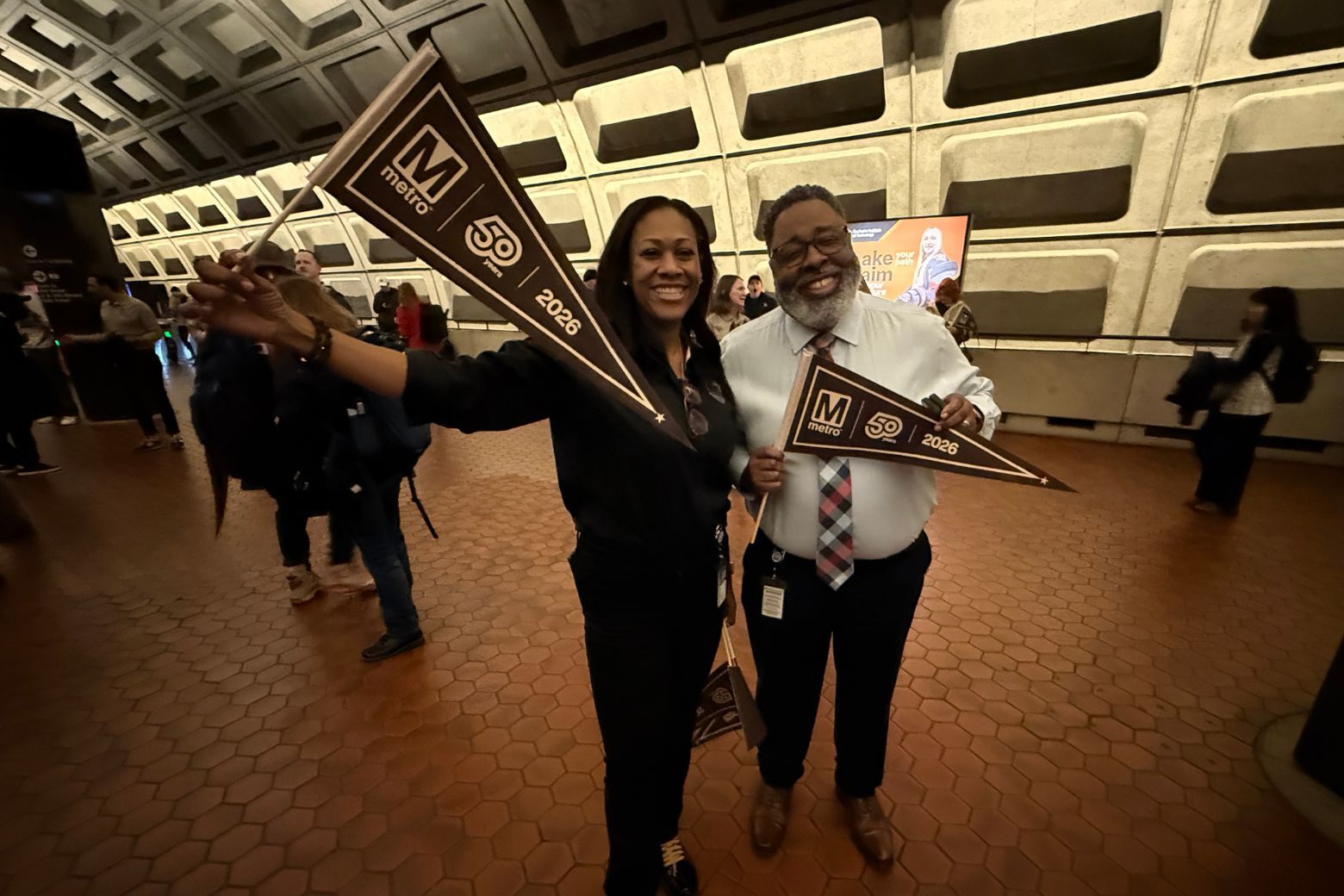 General Manager Randy Clarke joined dozens of fellow employees at the top of the stairs of the rail station at 12th & F streets NW, greeting passengers, thanking them for riding Metro and handing out specially designed pennants on Friday morning.