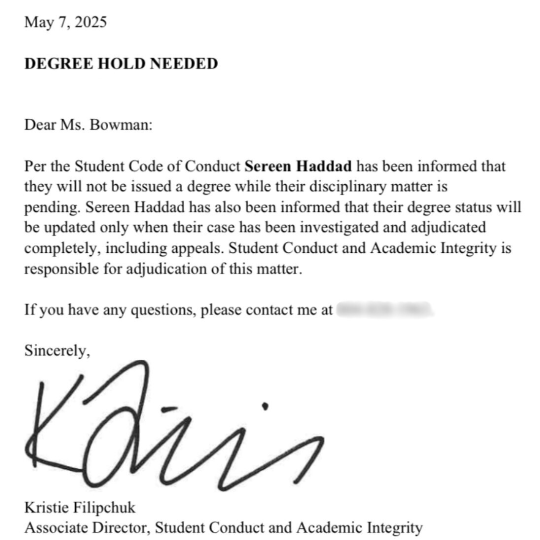 The statement also addressed the hold on Sereen’s diploma, adding that until the “student conduct process has been fully resolved,” some students will not receive their diplomas.