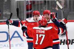 Matt Roy’s shot from the right circle was deflected in by Frank with 14:54 to play. Then Frank scored on a redirect with 1:54 remaining after the Capitals had pulled their goalie.