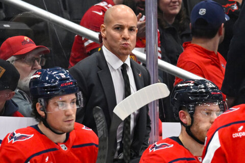 McCann thought he had his second career hat trick when he scored on a breakaway 1:27 into the third. But while all the hats tossed onto the ice were being swept up, it was announced that a double-minor penalty whistled against Beniers was under review. The call was confirmed, the goal was taken down and the Capitals went on the power play.