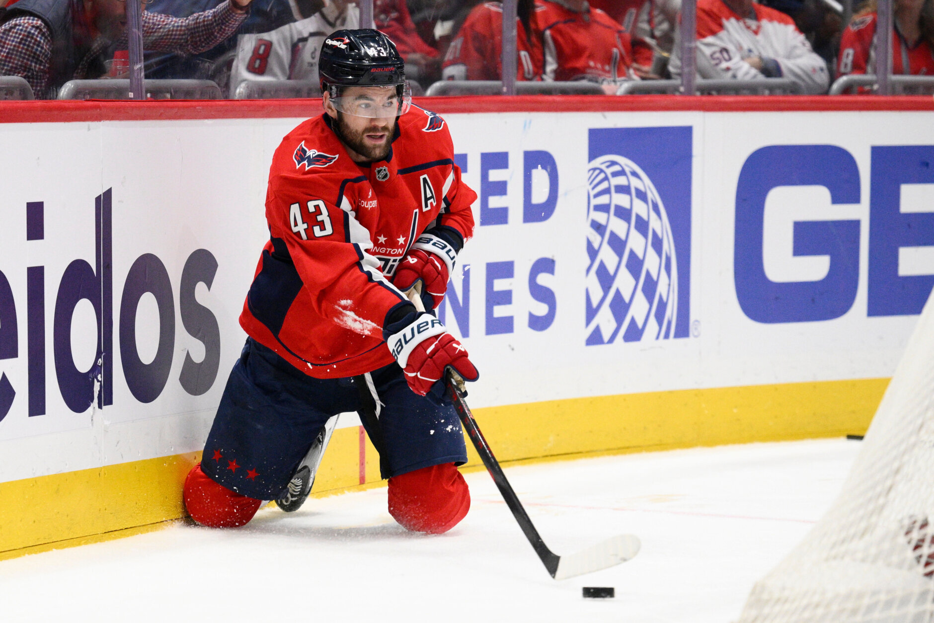 Flyers Capitals Hockey Washington Capitals right wing Tom Wilson (43) passes the puck during the first period of an NHL hockey game against the Philadelphia Flyers, Tuesday, March 31, 2026, in Washington. (AP Photo/Nick Wass)