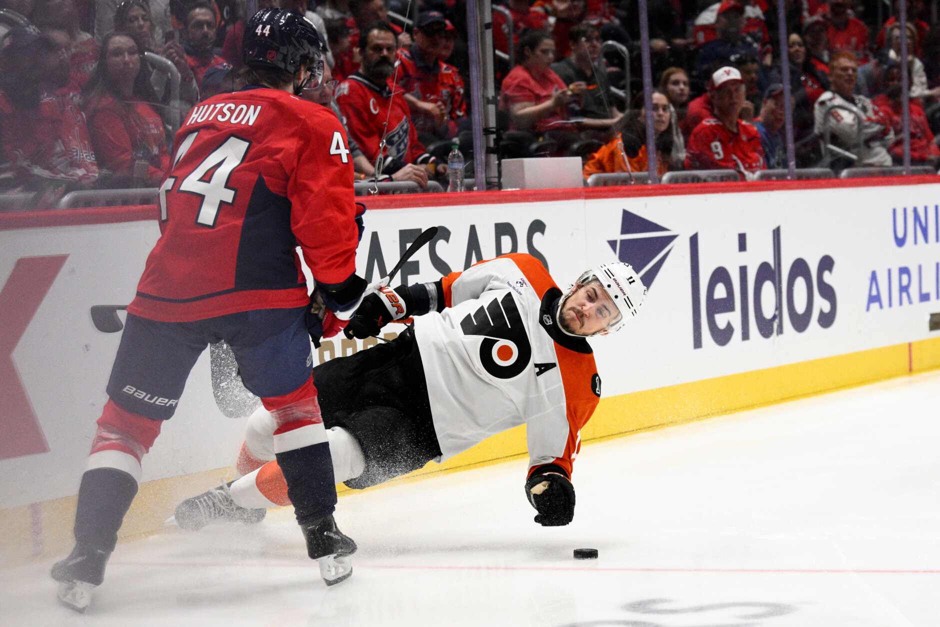 Flyers Capitals Hockey Philadelphia Flyers right wing Travis Konecny (11) falls to ice next to Washington Capitals defenseman Cole Hutson (44) during the second period of an NHL hockey game, Tuesday, March 31, 2026, in Washington. (AP Photo/Nick Wass)