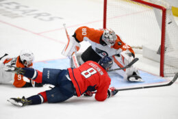 Flyers Capitals Hockey Washington Capitals left wing Alex Ovechkin (8) scores a goal past Philadelphia Flyers goaltender Dan Vladar (80) and defenseman Jamie Drysdale (9) during the third period of an NHL hockey game, Tuesday, March 31, 2026, in Washington. (AP Photo/Nick Wass)