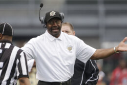Arkansas-Pine Bluff head coach Monte Coleman argues a call in the first half of an NCAA college football game for the SWAC championship against Jackson State at Legion Field in Birmingham, Ala., Saturday, Dec. 8, 2012. (AP Photo/Dave Martin)